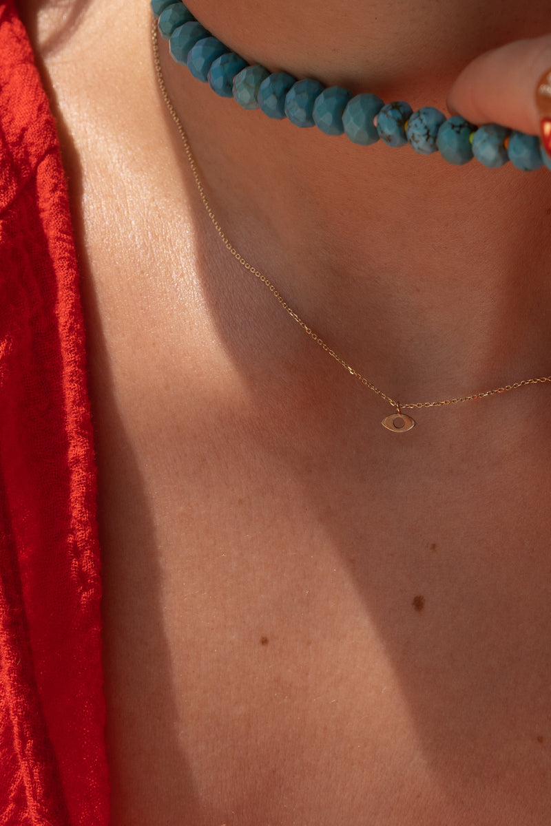 Our Petite Evil Eye Necklace is a unique masterpiece, artisan-crafted from solid 9ct Gold in our London atelier.