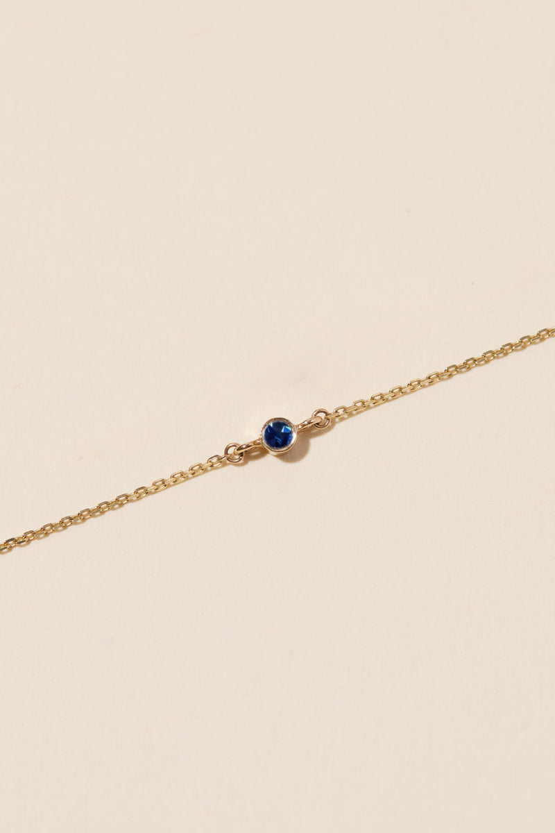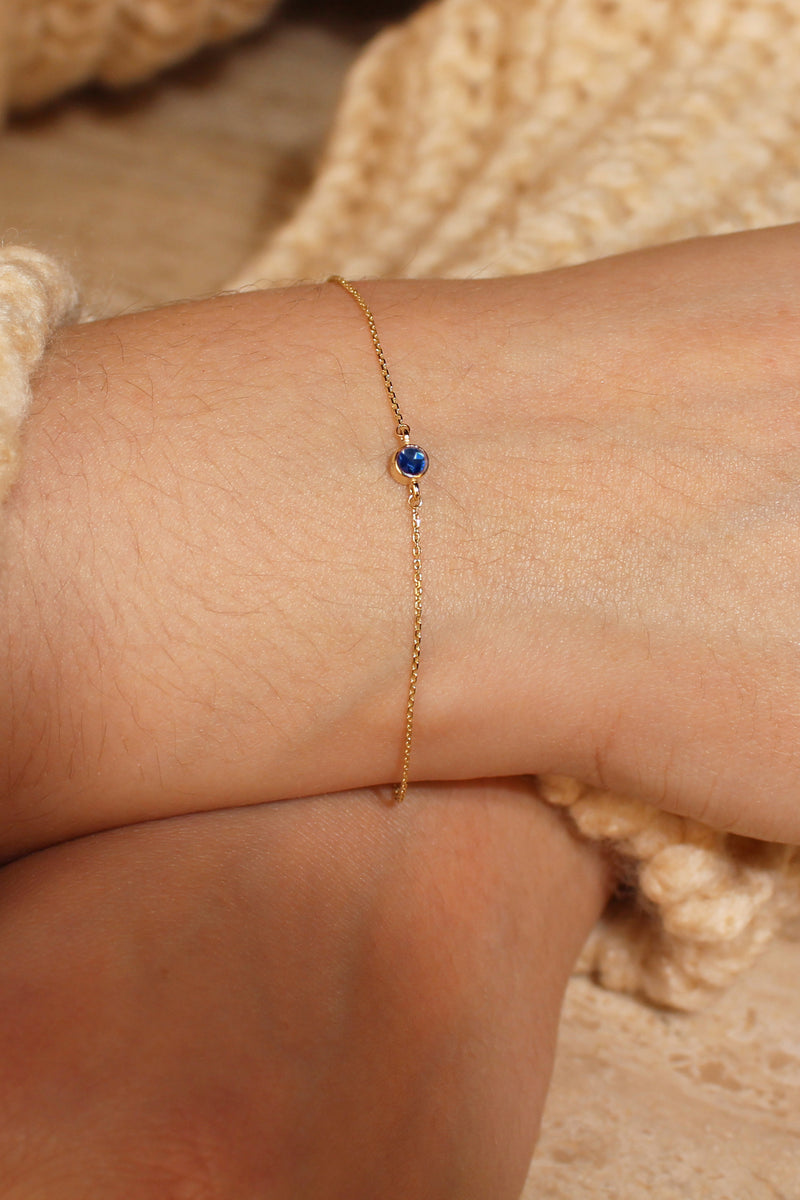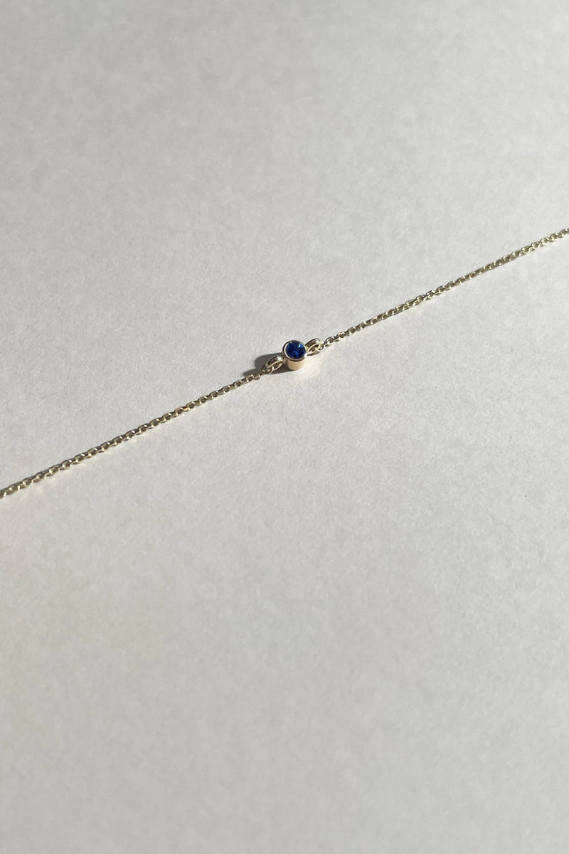 Part of the Ari Collection, this timeless Petite Sapphire Bracelet features a dainty Blue Sapphire set in complementary 9 carat Yellow or Rose Gold. The diameter of the sapphire and gold setting is 2mm.