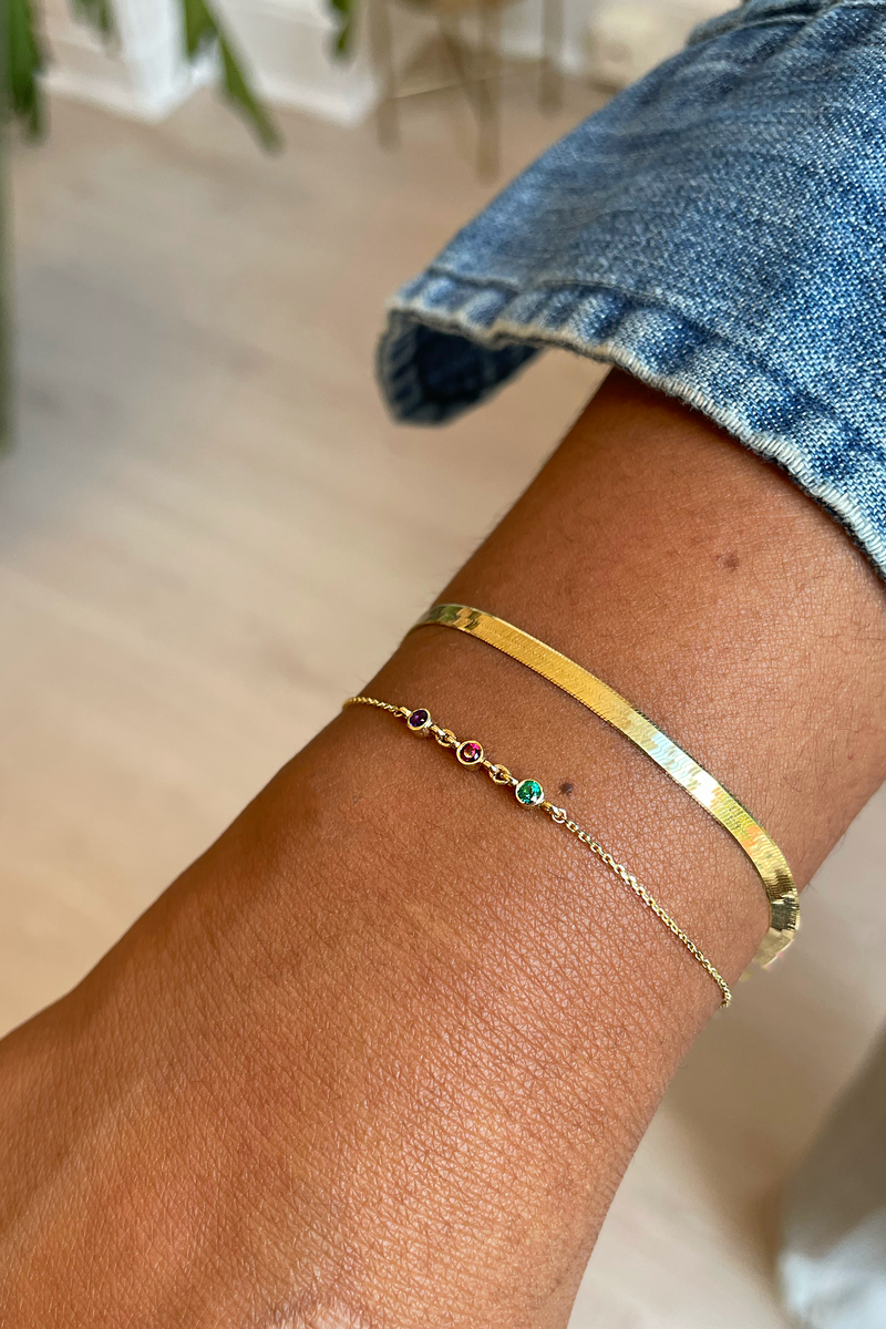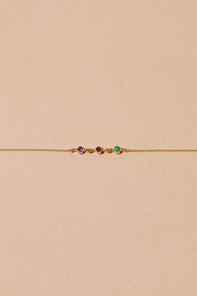 Introducing the Bezel Birthstone Bracelet. This beautiful, dainty bracelet can be customised with precious gems of your choosing, creating meaningful piece that you'll cherish forever.