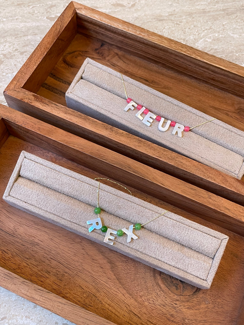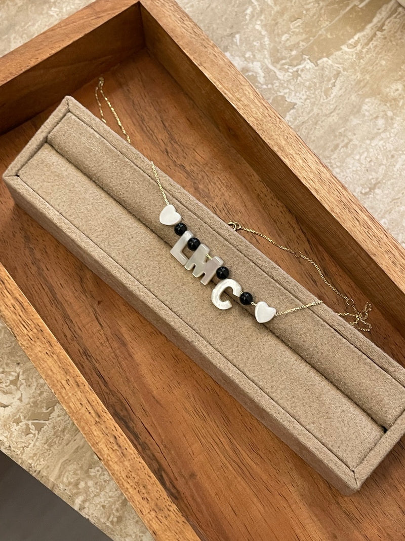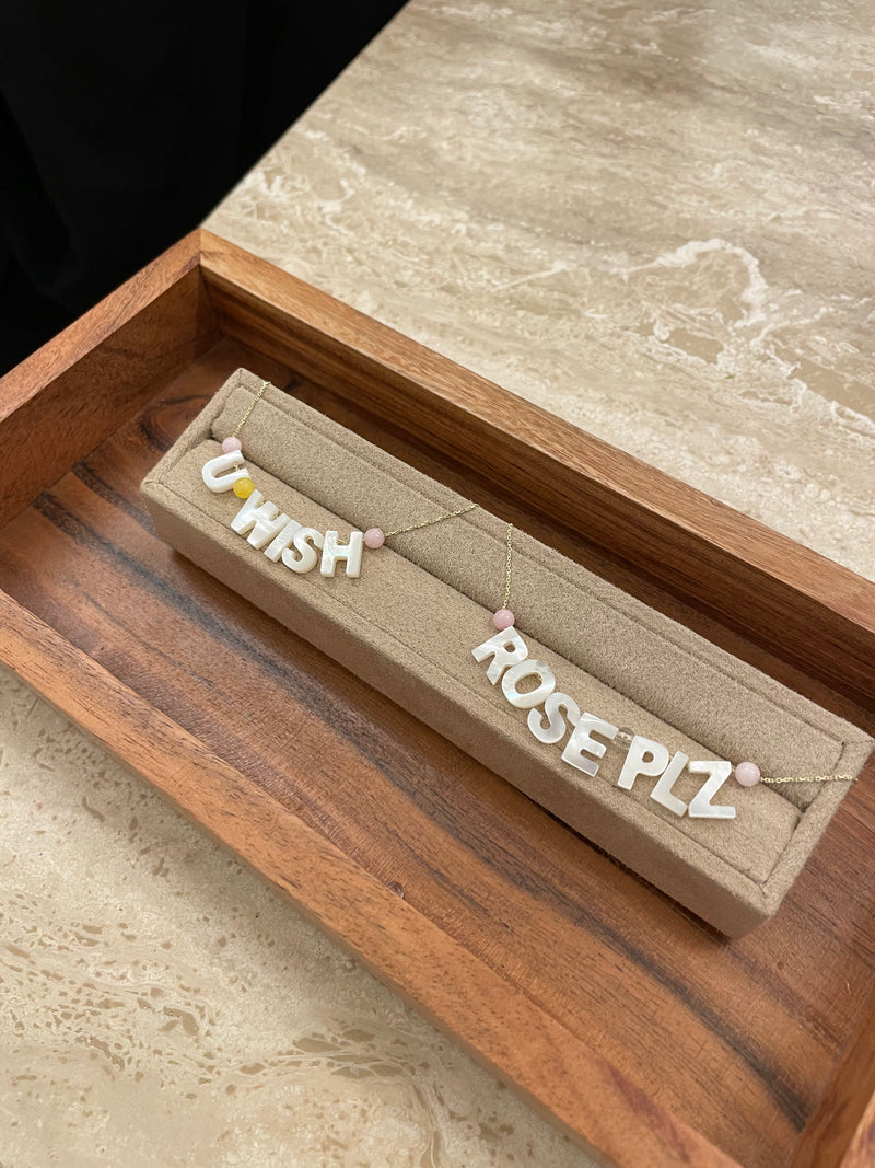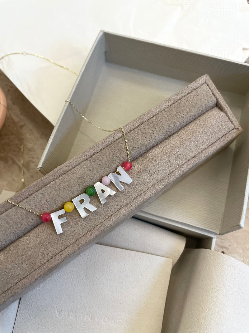 The Charmfetti Necklace is a fun new personalised necklace that features our Mother of Pearl Letter pendants threaded onto our signature Solid 9ct Yellow Gold chain.