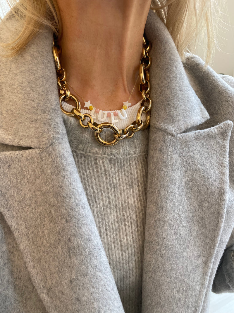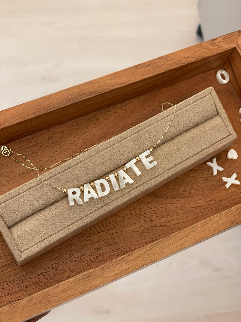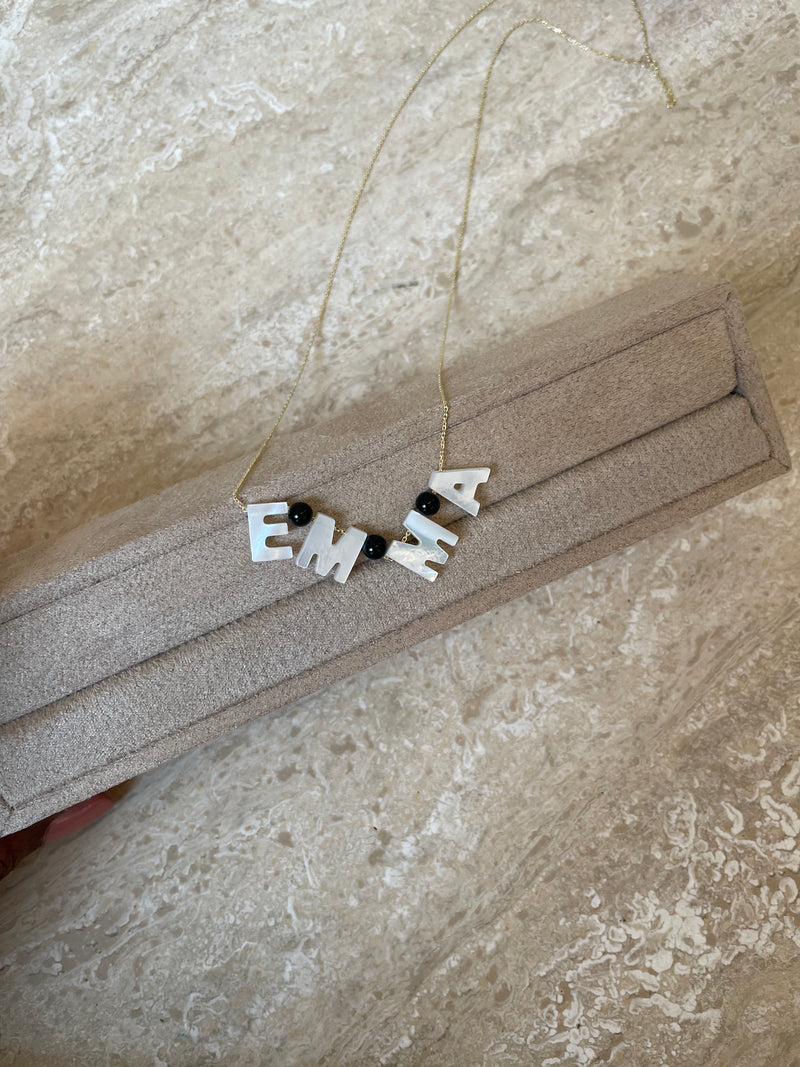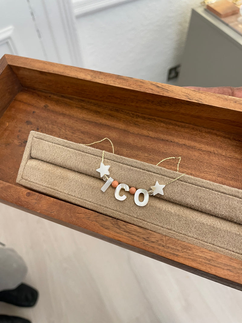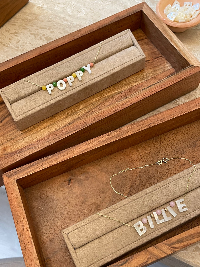 The Charmfetti Necklace is a fun new personalised necklace that features our Mother of Pearl Letter pendants threaded onto our signature Solid 9ct Yellow Gold chain.