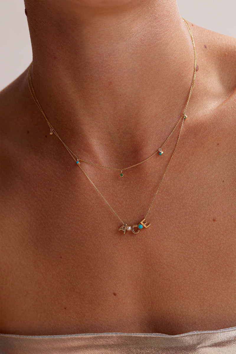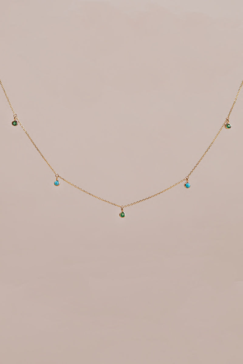 Environmentally friendlier lab-grown Emerald pieces offering a dainty burst of colour. This piece has a mixture of bright Turquoise alongside deep Emeralds to bring a pop of colour to your day.