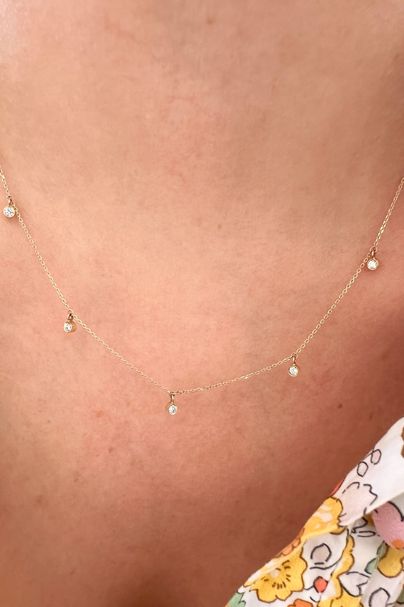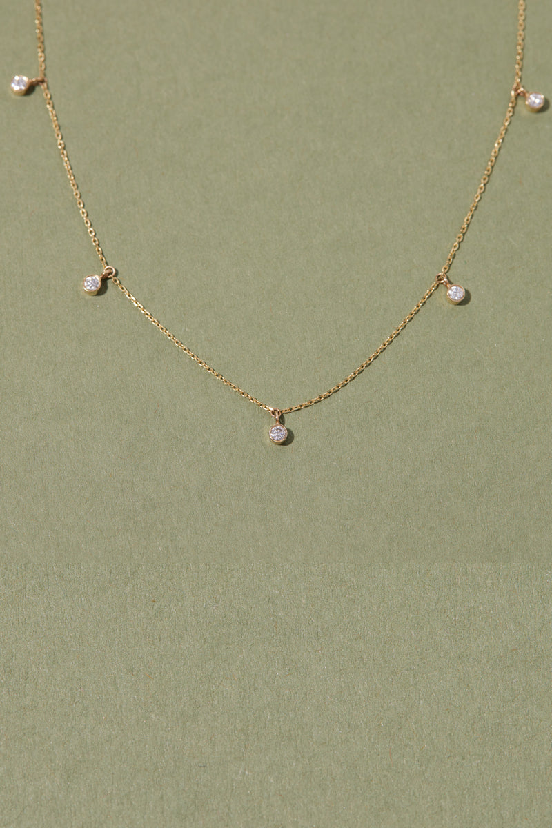 Capture the timeless beauty of diamonds with the Forever Charmed Diamond Necklace. Crafted from solid gold, this beautiful necklace features a 5 dainty diamonds, set to sparkle and elevate your look with an elegant touch.