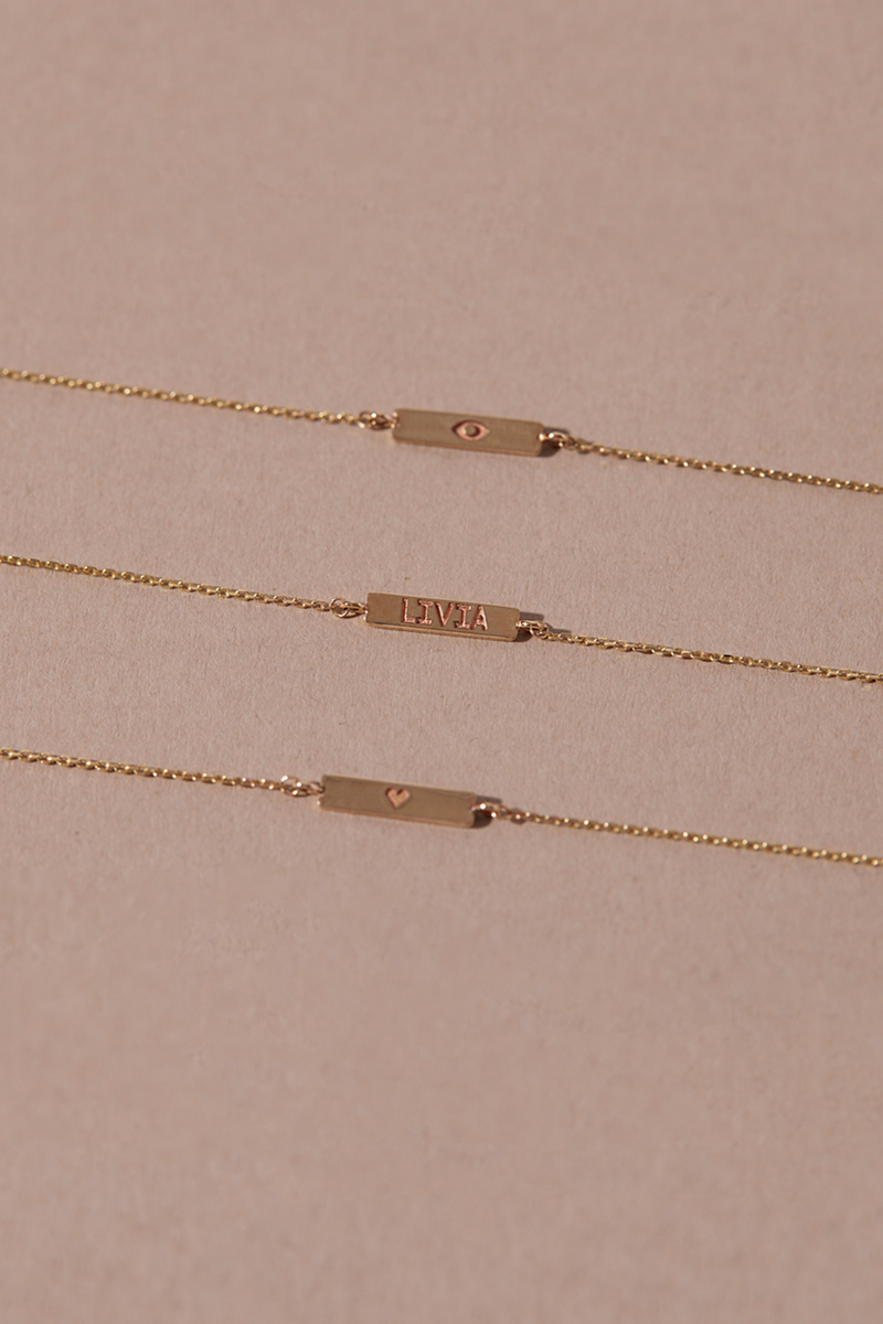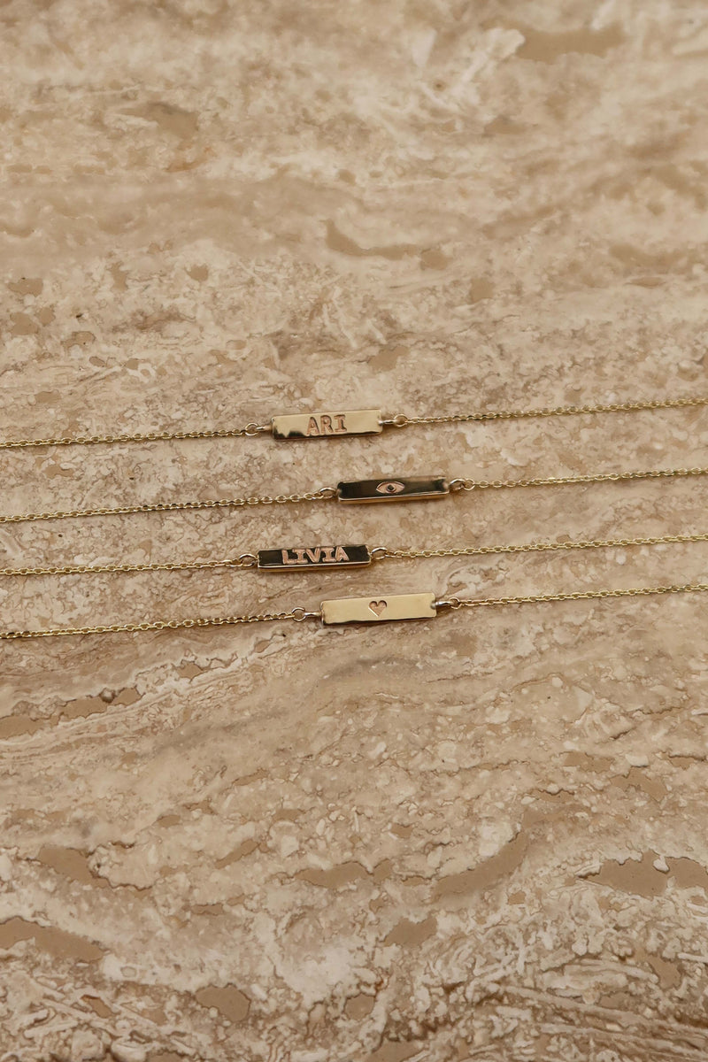 Introducing our Gold Bar Bracelet; a dainty solid 9ct gold bar engraved as you wish and attached to our signature diamond cut chain.   Choose from a simple symbol, name or monogram of your choice up to 10 characters with complimentary engraving.