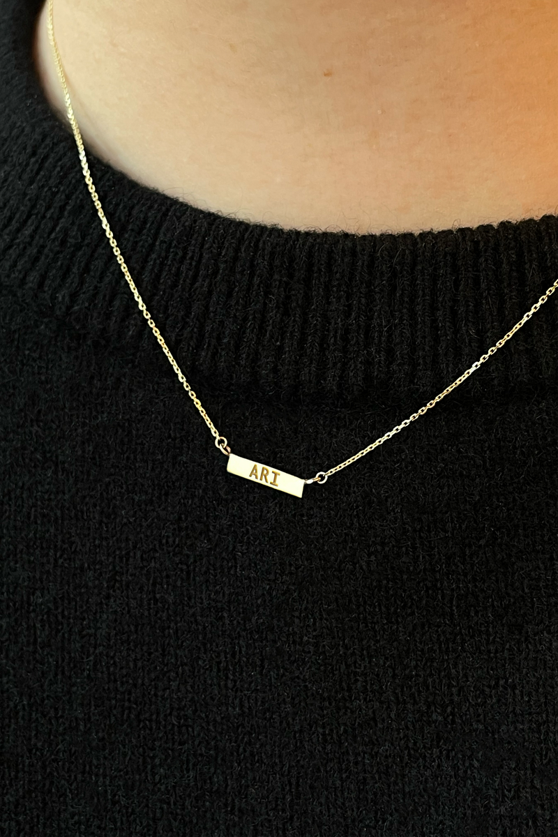 Introducing our Gold Bar Necklace; a dainty solid 9ct gold bar engraved as you wish and attached to our signature diamond cut chain. Chose from a simple symbol, name or monogram of your choice up to 10 characters with complimentary engraving.