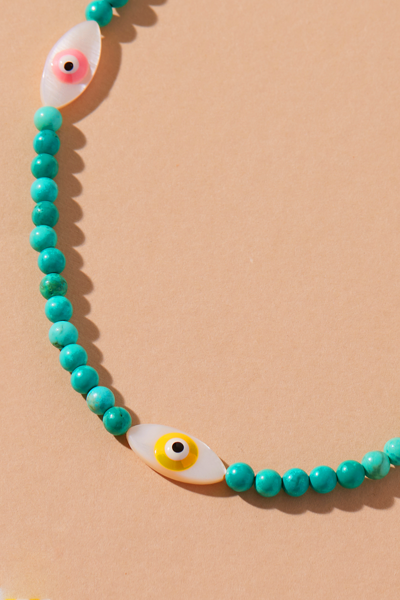 Combining Dyed Teal Turquoise Howlite Beads with a Mother of Pearl Evil Eye and a Solid Gold Bead, it's the perfect way to add some fun and colour to your style.