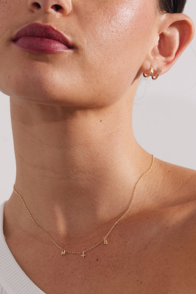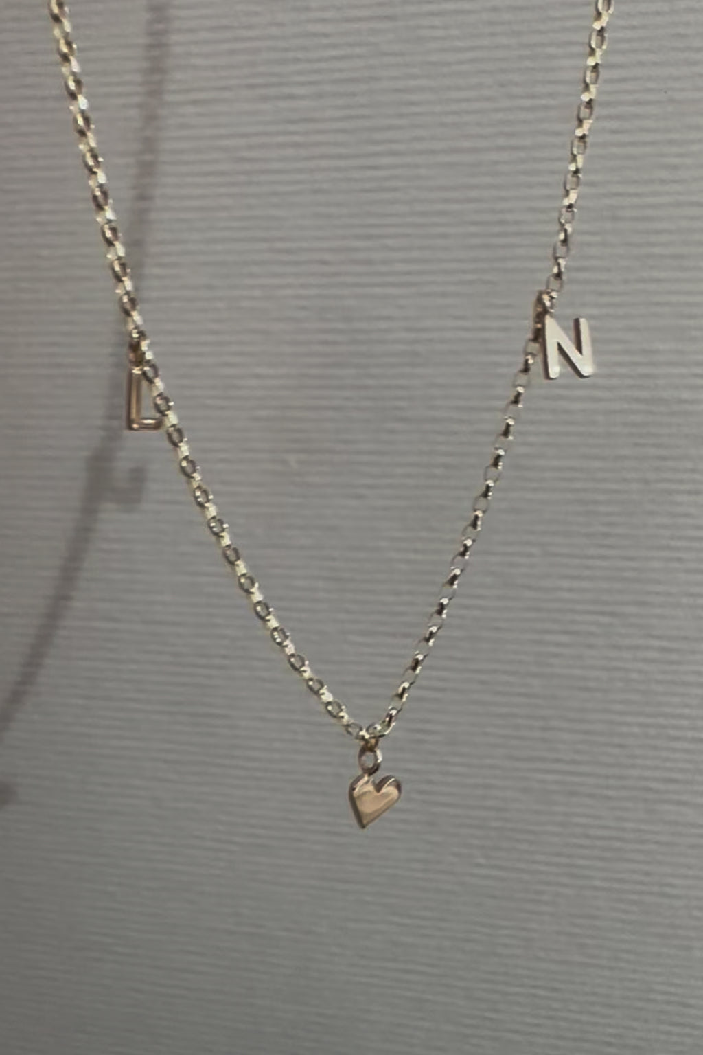 Meet our new I Love You necklace; which is a fusion of our bestselling Charmed Letter Necklace and our Connect Name Necklace.  This style features 2 letters, with a centre charm of your choice. Each letter pendant is 4mm high and there is a 2cm gap between each letter. You can select between 3 centre charms; a heart, a star or a plus sign.